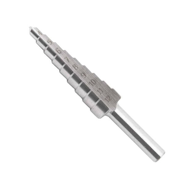 Seu design escalonado permite criar furos em diferentes diâmetros, de 4 a 12 mm, facilitando a adaptação a diversas aplicações.