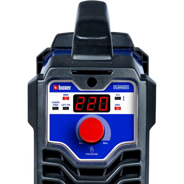 Equipado com um display digital intuitivo, o modelo Flama 221 permite ajustes rápidos e precisos, facilitando a configuração da corrente de soldagem e outros parâmetros.
