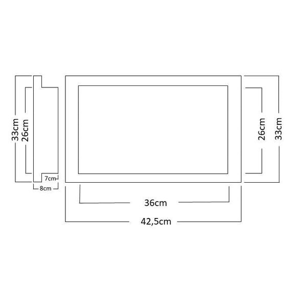 Dimensões externas: 42,5cm x 32,5cm / profundidade: 8cm