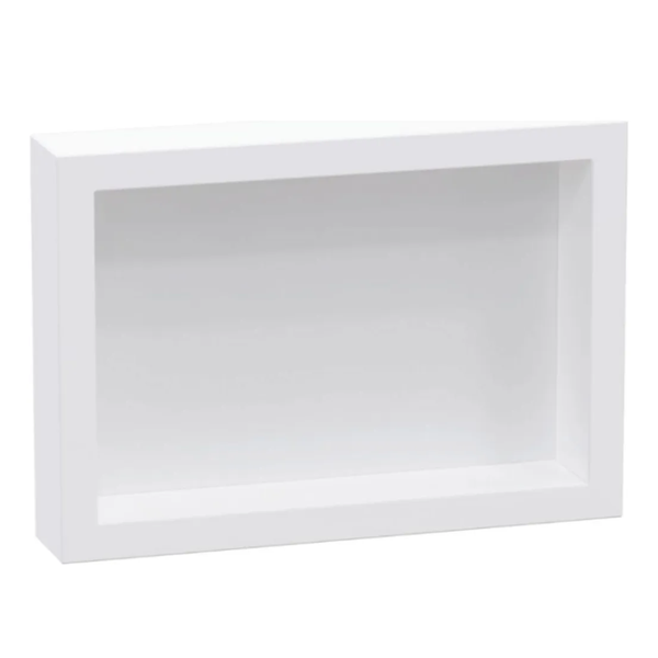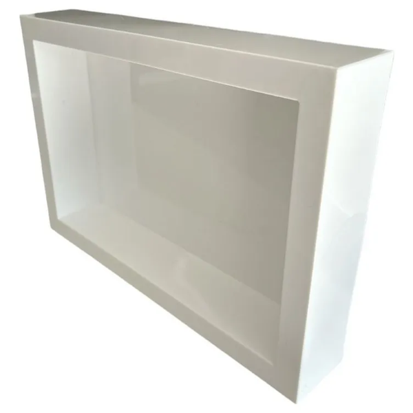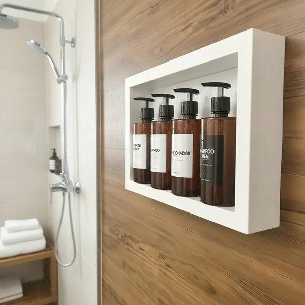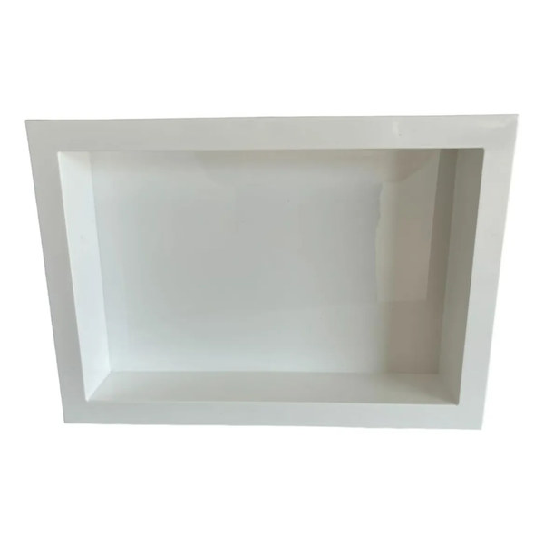 O nicho de sobrepor 28x40 cm é uma prateleira/compartimento de parede em formato retangular, projetado para ser fixado diretamente na parede sem necessidade de abertura ou quebra de alvenaria.
