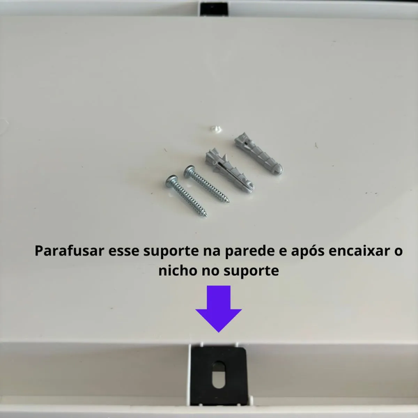 Kit de instalação incluso: o nicho já vem com suportes, parafusos e buchas, facilitando a fixação na parede.