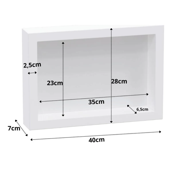 Dimensões externas: 28 cm de altura x 40 cm de largura x 7 cm de profundidade.