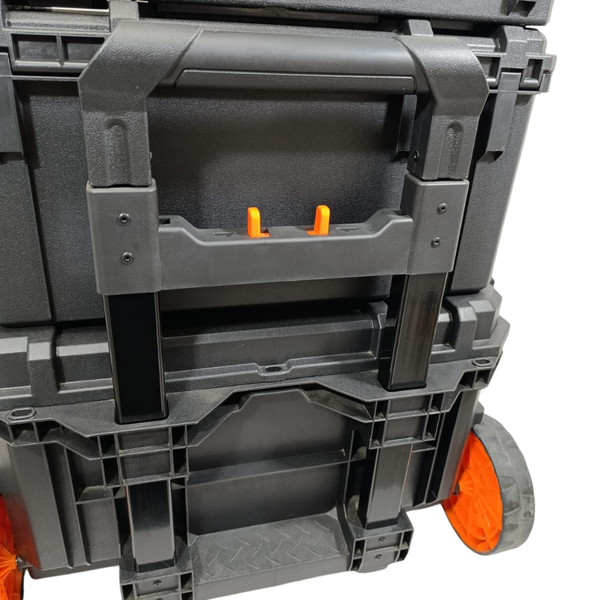 As rodas integradas e a alça retrátil facilitam o transporte, permitindo arrastar a caixa com facilidade.